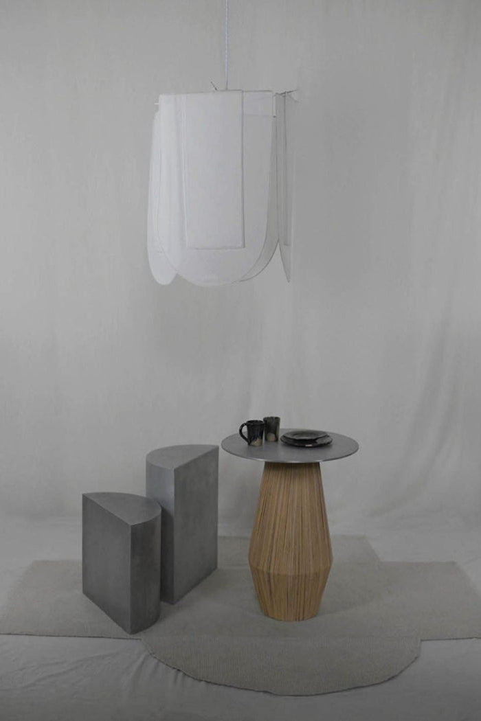 Composed around a light structure in cream painted steel, TOTEM is inspired by Japanese kakemonos and their long rectangular panels. Totem is revisited through a combination of different geometric shapes in 8 panel and the choice of a light, translucent fabric.