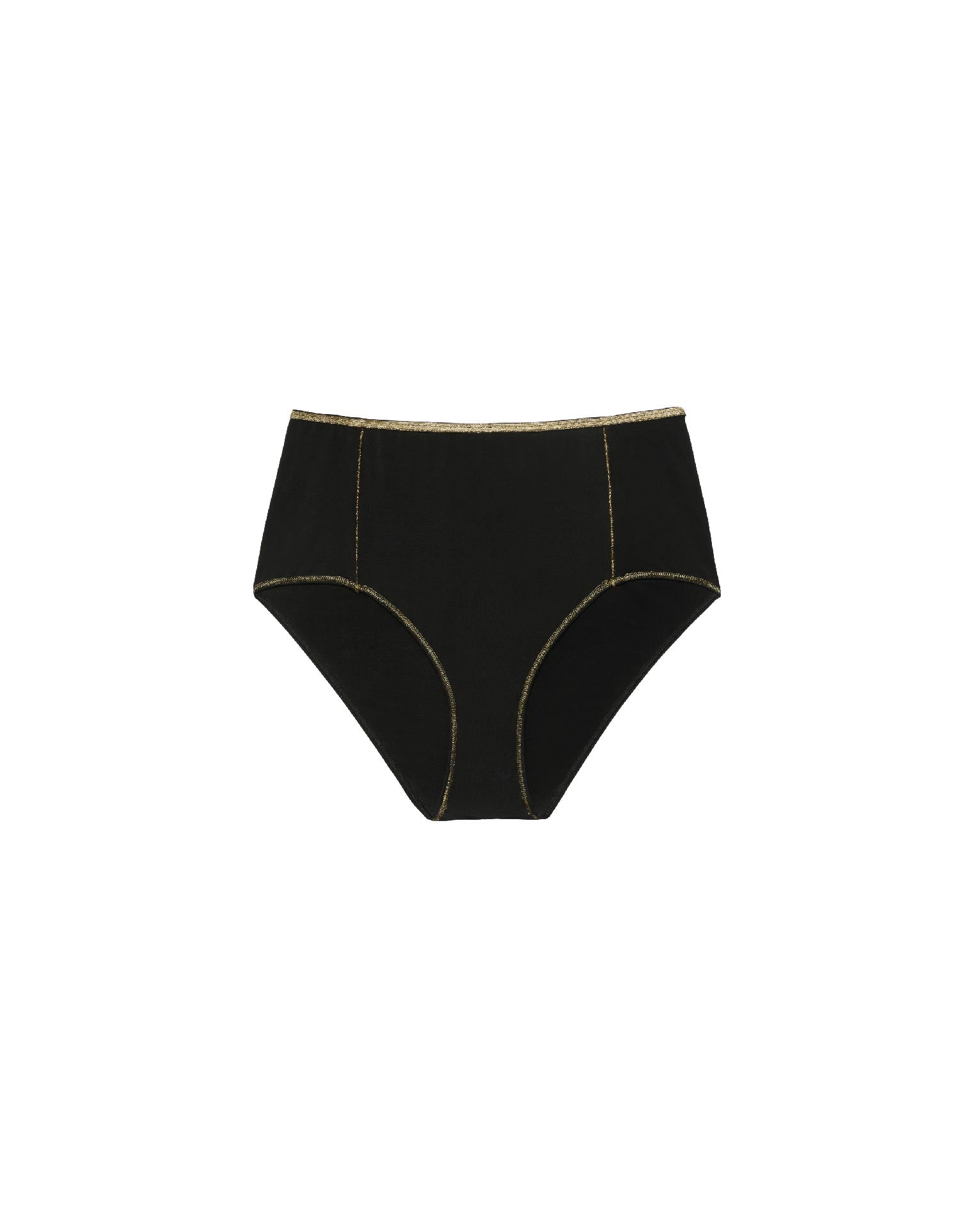 From the Timeless Pieces range – the high-rise briefs! With a revealing cut on the bum, for an elongating effect on the legs. High-rise briefs are ideal for slimming the waist and hips. Elastic waistband in gold lurex. Two vertical lurex-trim seams to the front. Gathered fabric detail to the back.