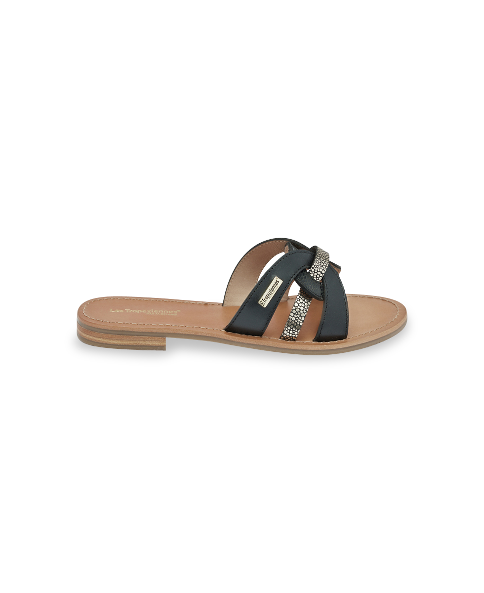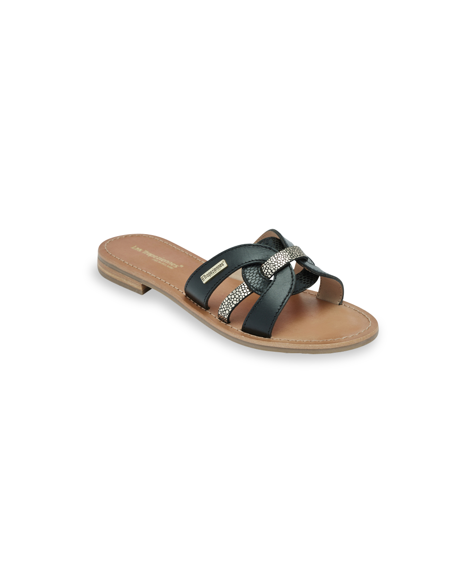 Fall for Hamsuko, a must-have flat mule for women. We love its unique design, with straps intertwined in a textured leather ring and metallic colors.