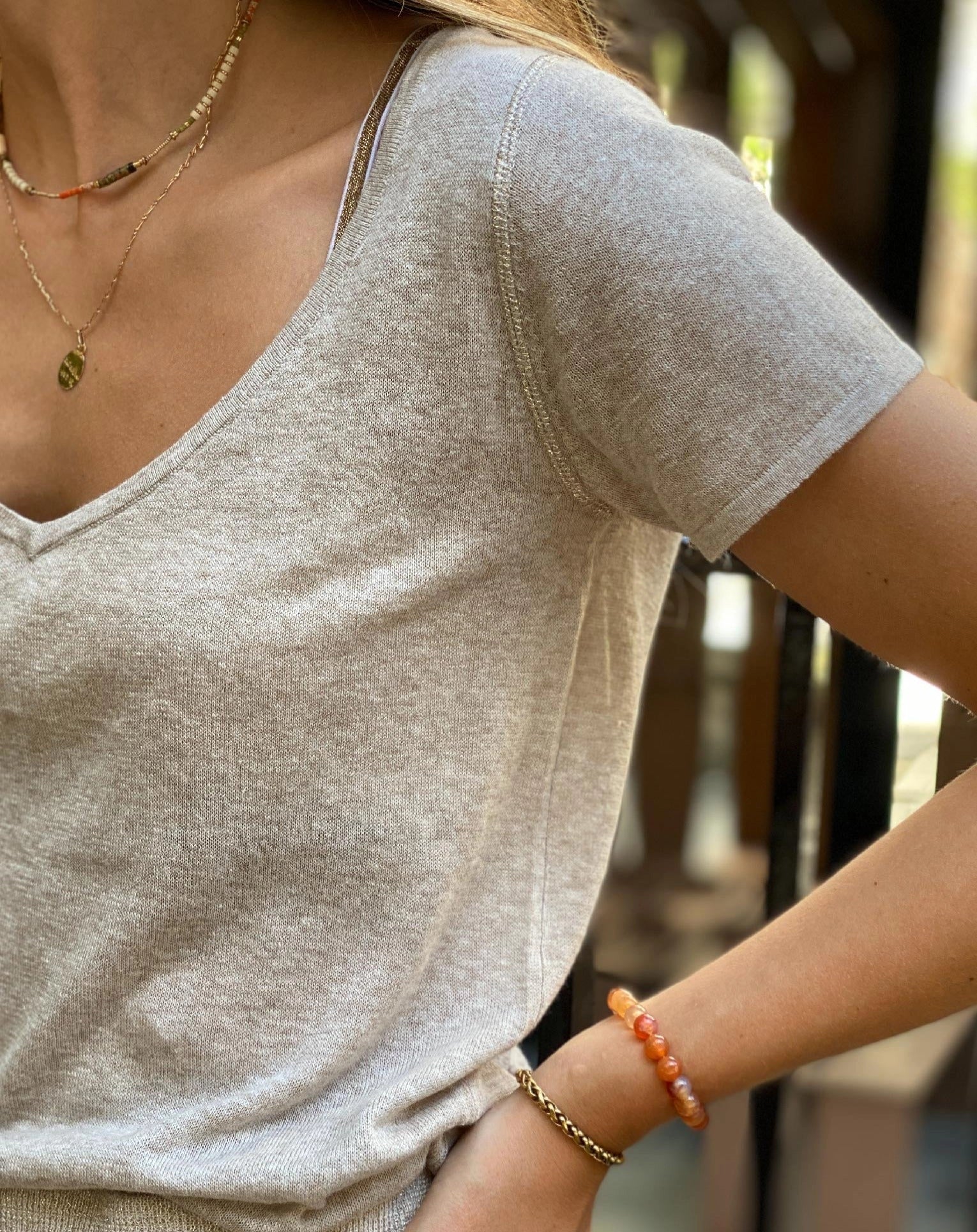 – Knitted with natural fibres, our Marcelle t-shirt is comfortable and durable.