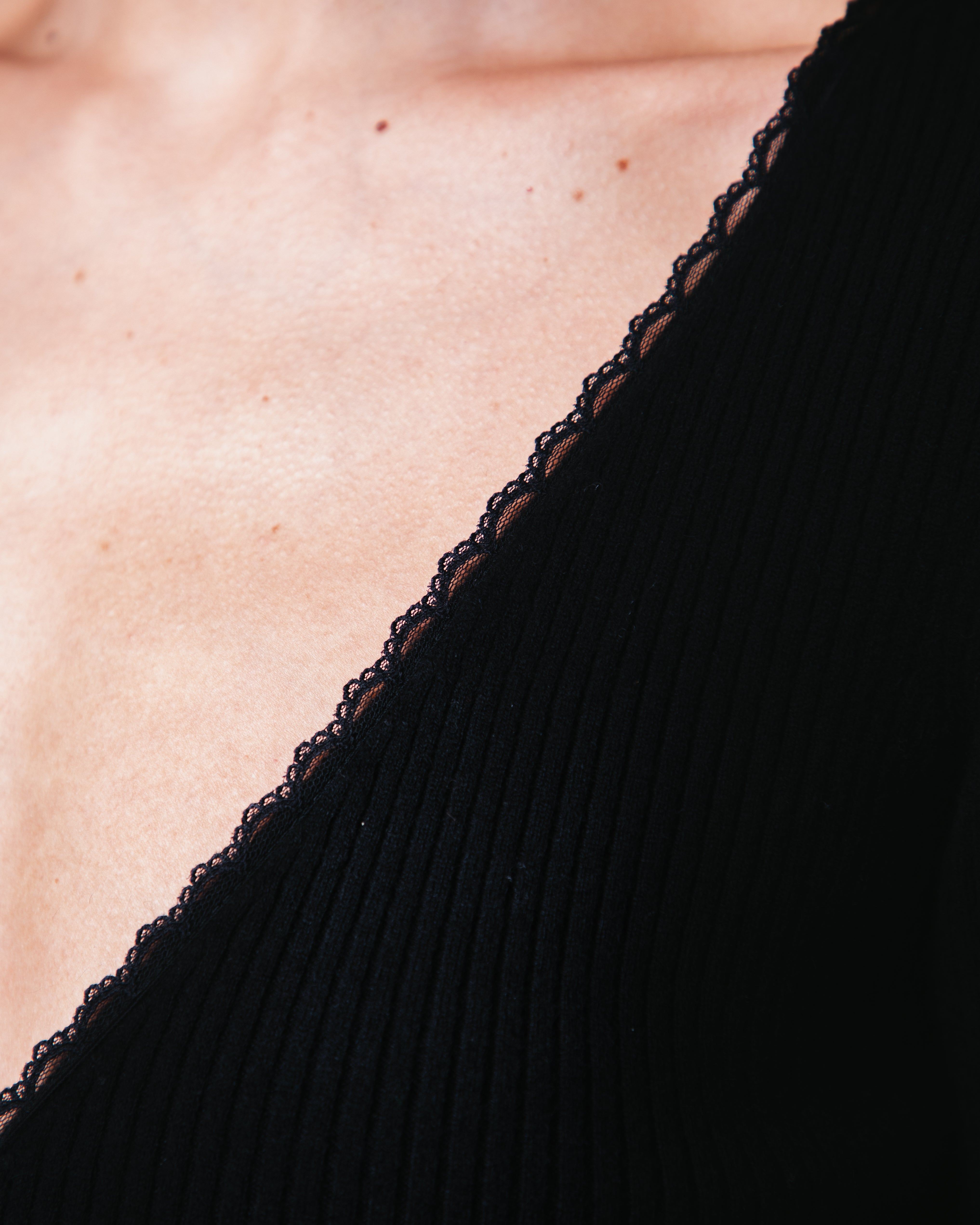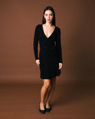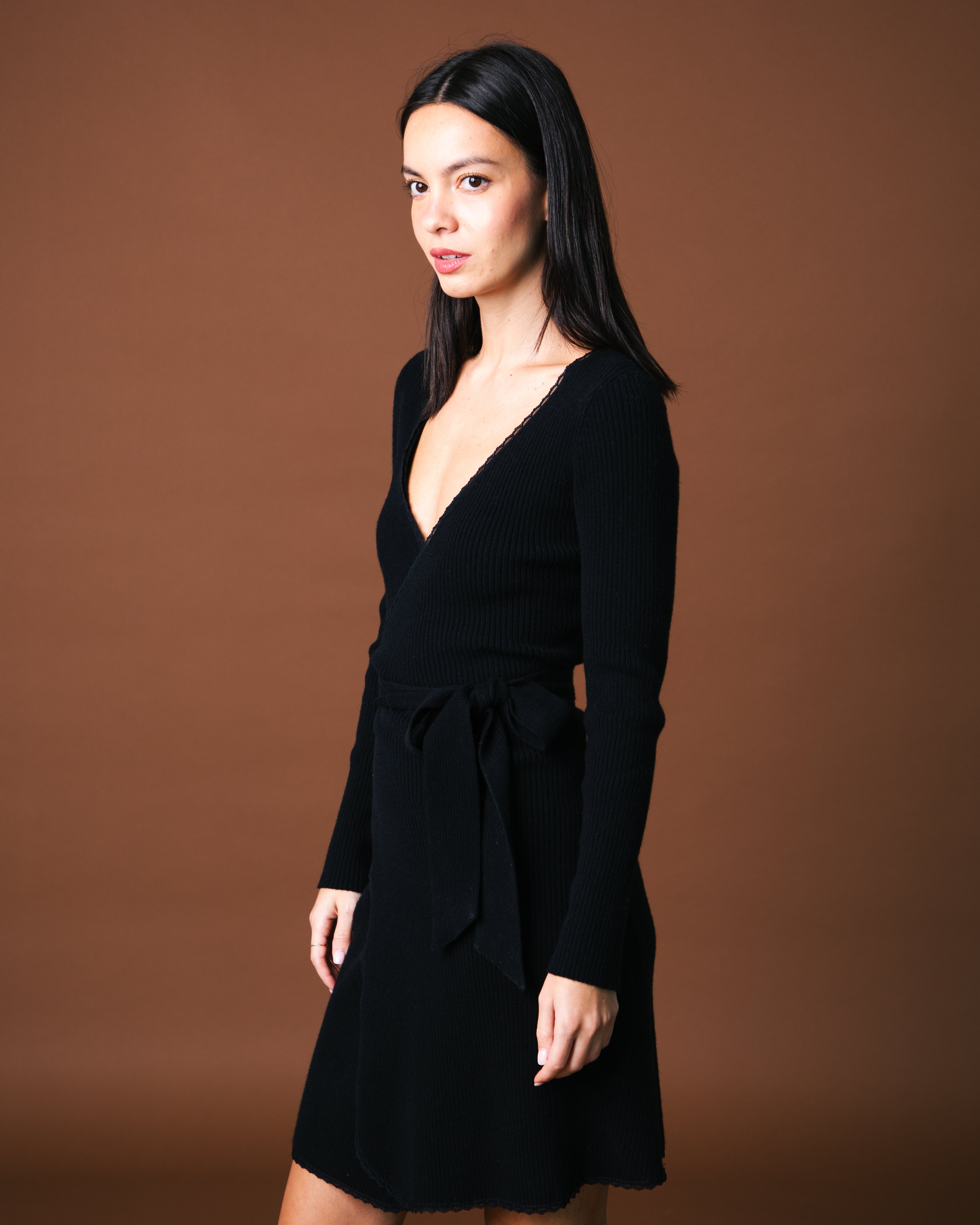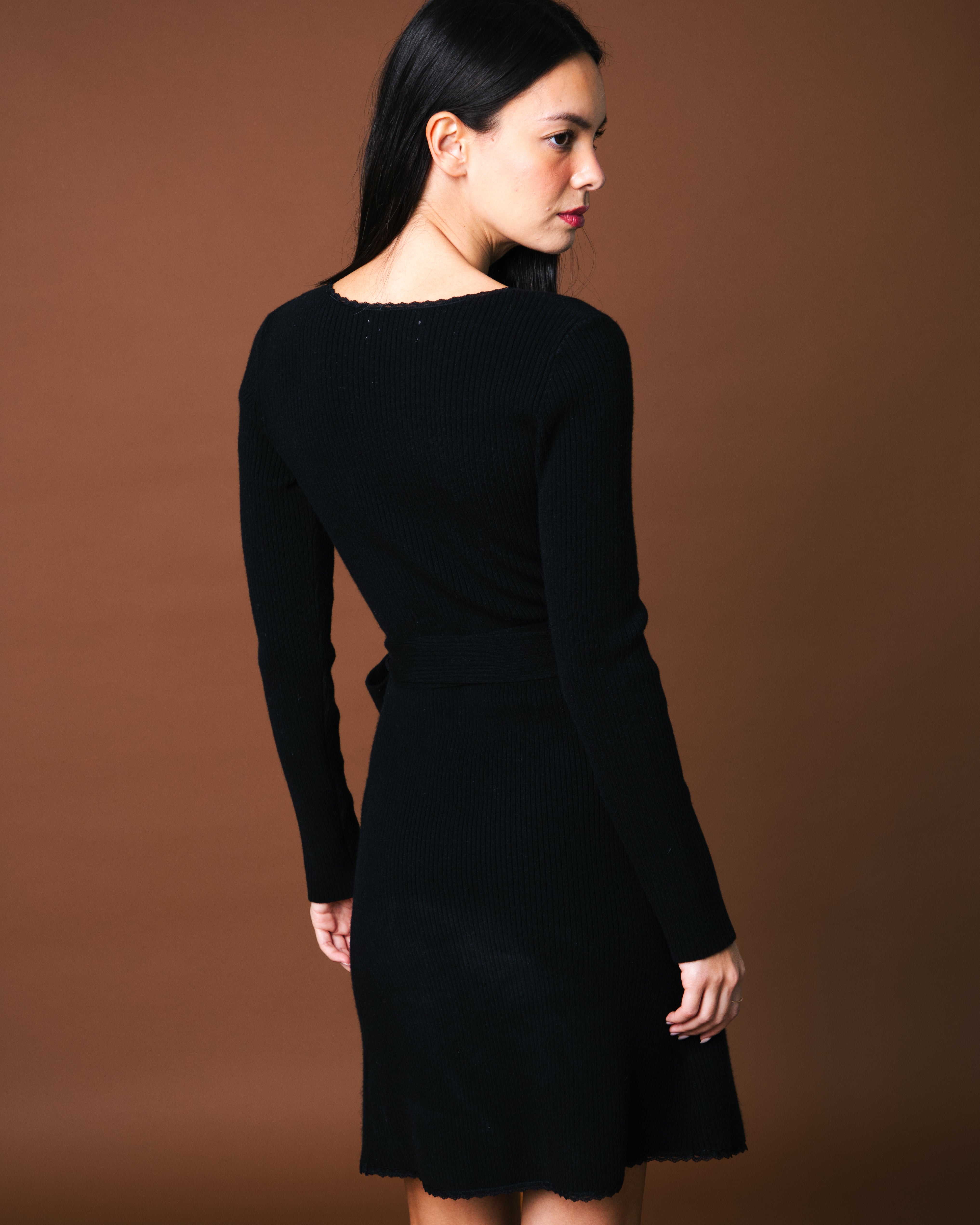 - Fitted cashmere dress with long sleeves- Rib knit, lace neckline- wrap-over shape with tie